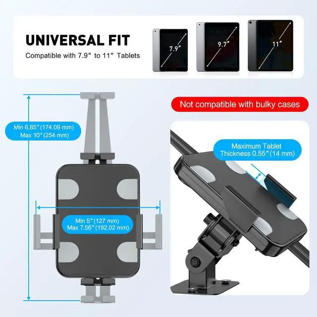 Wide Compatibility: Compatible with tablets ranging from 7.9" to 11" in size, including iPad, iPad Pro, Galaxy Tab, and more, accommodating up to 0.55 inches thickness effortlessly as a versatile wall ipad holder.