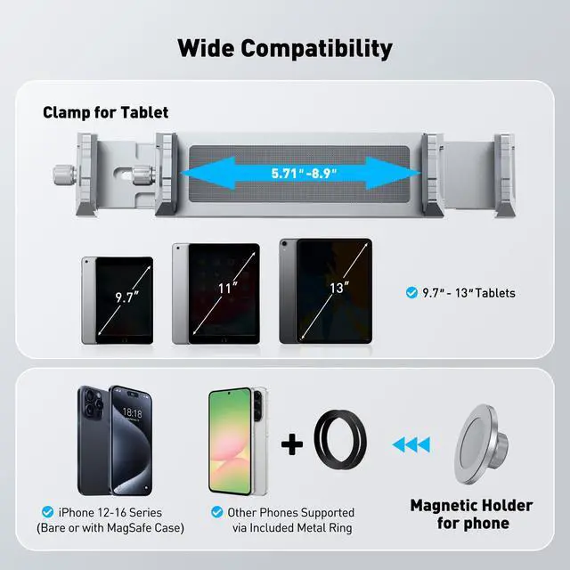 2 in 1 Phone & iPad Stand: Clamp or magnetic holder in one stand; works with devices that have built-in magnets or with the included 4 metal rings (2 large for tablets, 2 small for phones); swap heads to fit your setup.