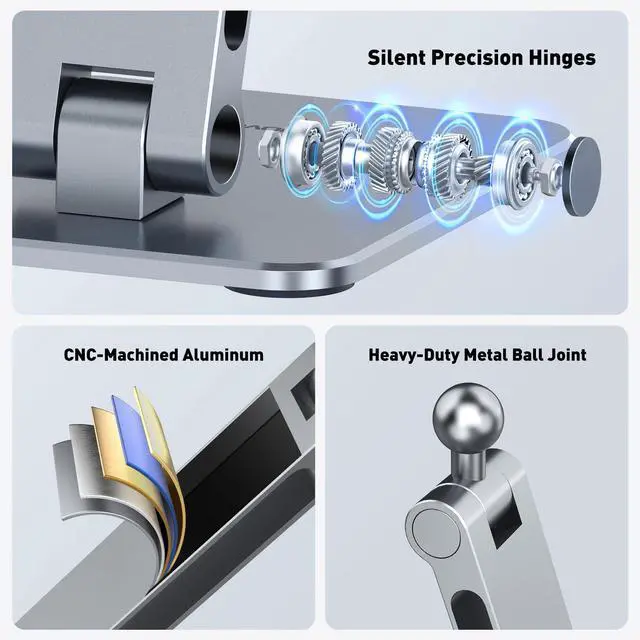 Premium Build & Smooth Control: CNC-machined aluminum with silent precision hinges for exact positioningthis tablet stand offers 360° rotation and -90° to 90° tilt for comfortable viewing across work, study, and display.