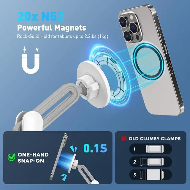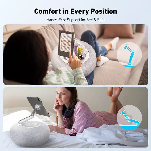 Ultra-Strong Magnetic Mount, Secure Hands-Free Viewing: Forget flimsy holders! Our ipad stand uses 20 industrial-grade N52 magnets for a powerful, secure grip. This kindle pillow stand provides exceptional stability, keeping your device from wobbling as you move. Includes universal metal rings to make all non-MagSafe tablets and phones instantly compatible.