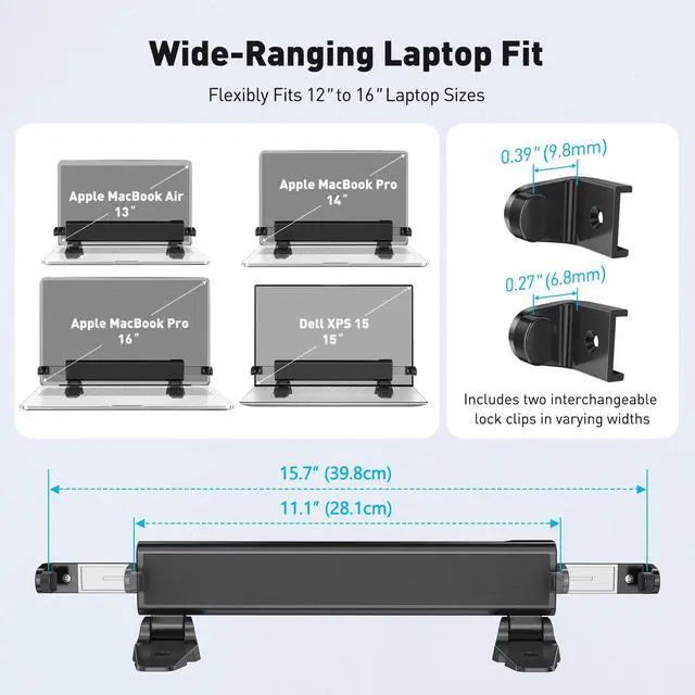 Diverse Laptops: Our AboveTEK Locking Station is designed to fit a wide range of laptops from 12" to 16", including MacBook, MacBook Air, Surface Pro and Chromebooks. Its adjustable arms accommodate widths from 11.1" to 15.7", ensuring compatibility with various models ^^ Enhanced Security with Keyed Lock and
