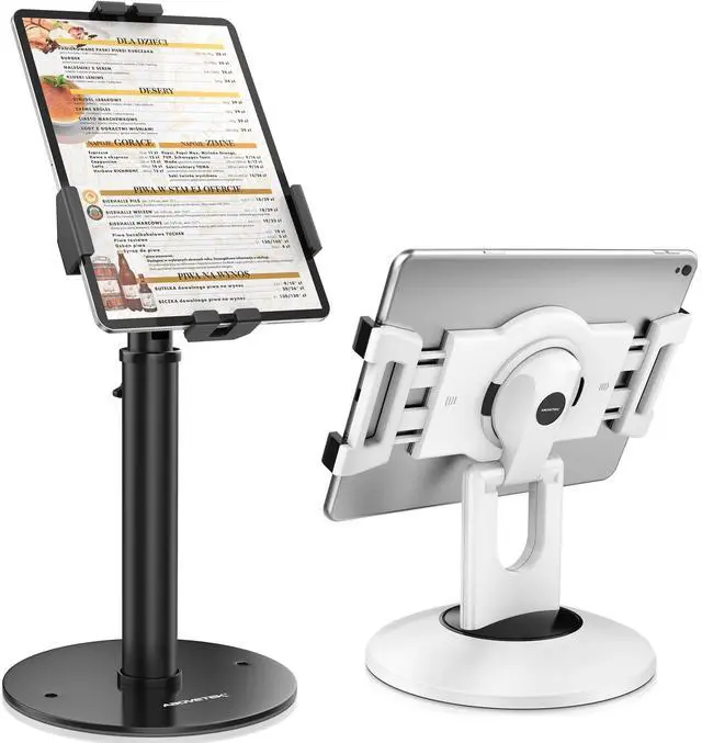 Highly flexible - The 360 rotatable base and tablet bracket holder combined with a folding arm offer unparalleled adjustment for typing or showcasing without missing any viewing angles. Turn display in a second between cashier and shopper or switch landscape/portrait mode instantly. ^^ Business-oriented - Two size rubber padded bracket holders collectively fit 6" - 13" tablets or any gadgets with width or height measurement in the range of 6.6" - 9.6" (Please noticed that both two clips fit cases less than 0.5" thickness), An ideal docking station stand for perfect match of large or small tablet pcs typically used at restaurant shop point of sale, office home desk, etc.
