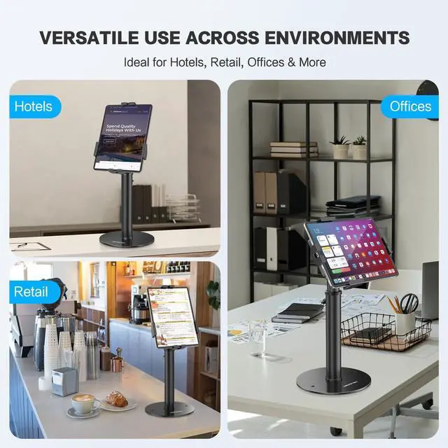 Universally Compatible: Featuring a sturdy tablet locking mount, the AboveTEK Security Tablet Kiosk Stand accommodates tablets from 7.9" to 11" (including iPad 9.7, iPad Air 3 ( 10.5 ), iPad 7th Gen ( 10.2 ), Samsung Galaxy Tab) and up to 0.55" thick. Perfect for retail and office POS systems, it boosts security and device adaptability.