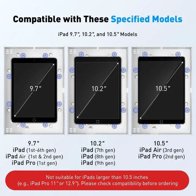 • Compatible iPad Model: This locking tablet stand is designed to fit 9.7" iPad, 10.2" iPad, 9.7" iPad Air, 9.7" iPad Air 2, 10.5" iPad Air, 9.7" iPad Pro and latest 10.5" iPad Pro. The security iPad stand suitable for varied professional needs and environments. Note: Not suitable for iPad models larger than 10.5 inches (e.g., iPad Pro 11-inch or 12.9-inch models). Please check compatibility before placing orders.
