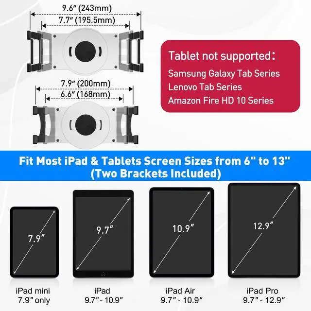 Highly flexible - The 360 rotatable base and tablet bracket holder combined with a folding arm offer unparalleled adjustment for typing or showcasing without missing any viewing angles. Turn display in a second between cashier and shopper or switch landscape/portrait mode instantly. ^^ Business-oriented - Two size rubber padded bracket holders collectively fit 6" - 13" tablets or any gadgets with width or height measurement in the range of 6.6" - 9.6" (Please noticed that both two clips fit cases less than 0.5" thickness), An ideal docking station stand for perfect match of large or small tablet pcs typically used at restaurant shop point of sale, office home desk, etc.
