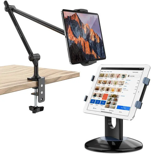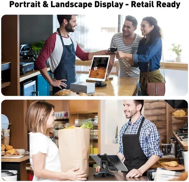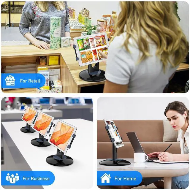 Highly flexible - The 360 rotatable base and tablet bracket holder combined with a folding arm offer unparalleled adjustment for typing or showcasing without missing any viewing angles. Turn display in a second between cashier and shopper or switch landscape/portrait mode instantly. ^^ Business-oriented - Two size rubber padded bracket holders collectively fit 6" - 13" tablets or any gadgets with width or height measurement in the range of 6.6" - 9.6" (Please noticed that both two clips fit cases less than 0.5" thickness), An ideal docking station stand for perfect match of large or small tablet pcs typically used at restaurant shop point of sale, office home desk, etc.
