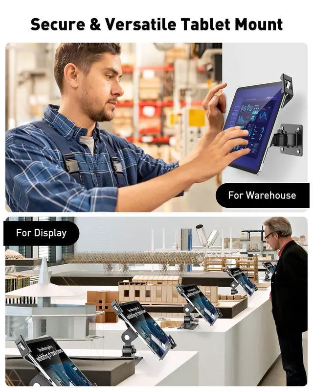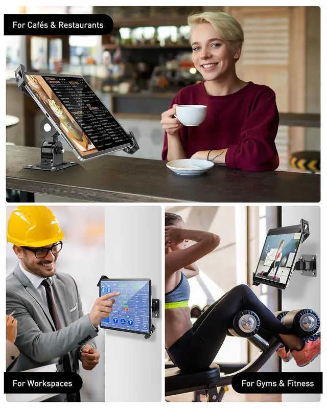 For Homes, Stores & Businesses - This tablet wall arm is a versatile way to maintain distance and provide user-friendly interaction for classrooms, conference rooms, recording studios, food delivery, restaurant to-go orders, healthcare facilities, virtual offices, gyms and kiosks as well as under kitchen cabinets for recipes and videos. ^^ 360 Portrait & Landscape Mode - Adjust and personalize your viewing preference with 360 rotation capability, allowing you to choose between portrait and landscape modes. Flexible joint design lets you easily tilt the screen to your desired angle to reduce glare and improve visibility.