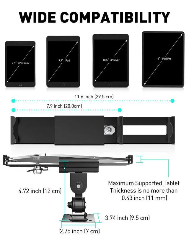 2 rubber pads on the bracket cushion your device while offering secure grip and protection. ^^ Universal Wall / Under Cabinet Mount - Universally compatible with 7 to 11 inch tablets including Apple iPad, iPad Pro, iPad Mini, Microsoft Surface, Samsung Galaxy Tab, Google Pixel Slate and Fire. Enjoy convenient hands-free use of your favorite tablet devices with the AboveTek Tablet Wall Mount Holder!