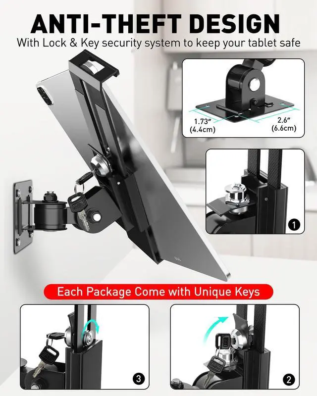 Great for indoor and outdoor use. ^^ Anti-theft Locking Security System - With the AboveTEK tablet holder wall mount you'll enjoy total safety and peace of mind with our anti-theft lock & key security system. This keeps YOUR tablet protected at all times and unable to be removed from the mount without a key. Ideal for customer-facing businesses and high-traffic points of sale. ^^ Easy Mounting and Installation - The AboveTEK wall mount tablet holder is easy to install on any wall and comes with mounting hardware included. Heavy-duty aluminum bracket and metal base ensure durability and wobble-free mounting of your device.