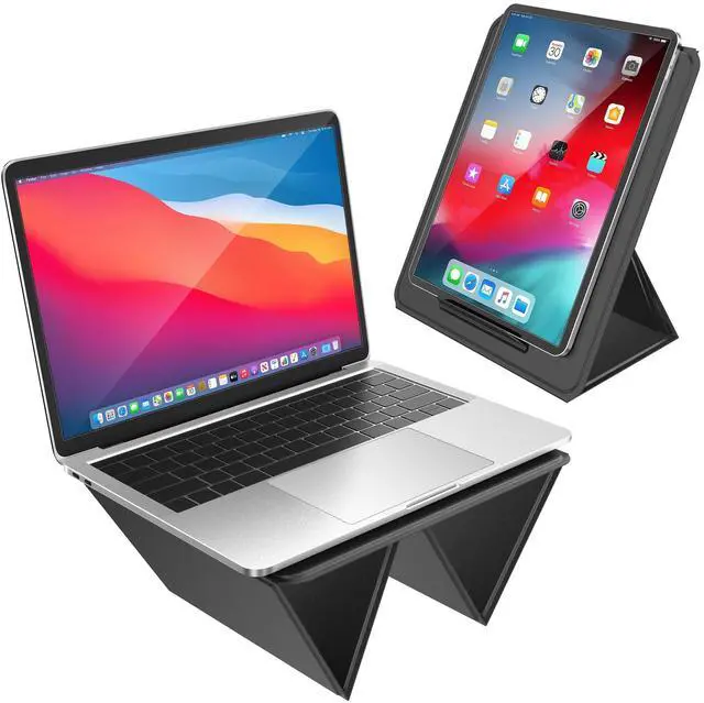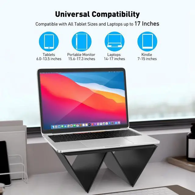 • Unmatched Device Harmony: Embrace universal fit with our ipad stands broad compatibility. Designed to cradle 14"~17" tablets, including the iPad and Kindle, and also accommodate MacBook Air/Pro, it's the quintessential tablet and laptop stand for the discerning user.