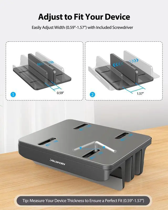 ^^ Adjustable Slots Width: The laptop docking station stand design features adjustable slot widths. Utilize the included Allen wrench to modify the rear holder's width ( 0.6" - 1.6" ) ensuring a perfect fit for your laptops, tablets, and phones.