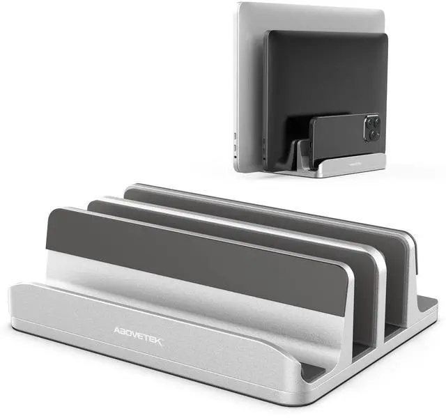 Versatility: AboveTEK Vertical laptop stand 3 slot design accommodates two laptops (up to 17.3" ) such as MacBook, laptops, and notebooks, along with a dock for phones. This heavy duty laptop holder is suitable for a wide range of devices.