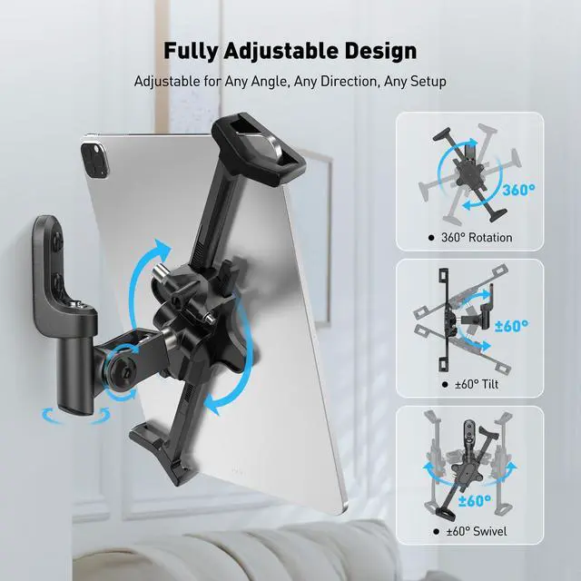 Flexible Viewing & Smart Access: Enjoy 360 rotation and smooth tilt for the best angle in portrait or landscape. This wall mount tablet holder ensures clear visibility and open portsideal iPad wall mount holder for check-in stations, kitchens, or conference rooms.