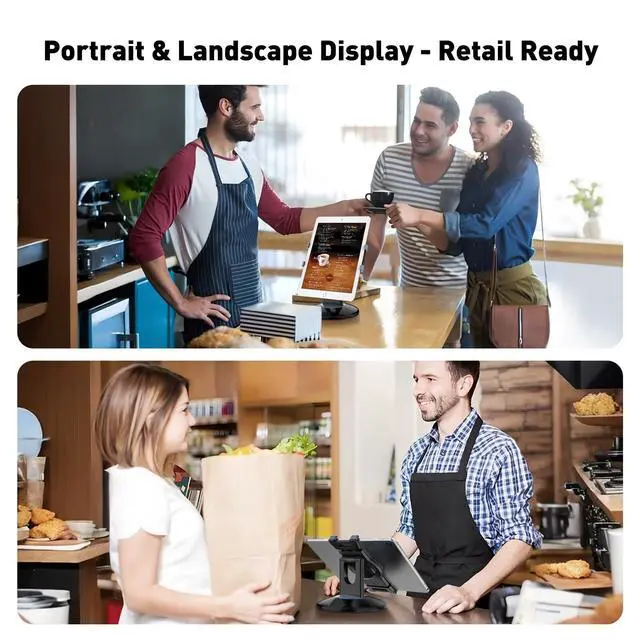 Highly flexible - The 360 rotatable base and tablet bracket holder combined with a folding arm offer unparalleled adjustment for typing or showcasing without missing any viewing angles. Turn display in a second between cashier and shopper or switch landscape/portrait mode instantly. ^^ Business-oriented - Two size rubber padded bracket holders collectively fit 6" - 13" tablets or any gadgets with width or height measurement in the range of 6.6" - 9.6" (Please noticed that both two clips fit cases less than 0.5" thickness), An ideal docking station stand for perfect match of large or small tablet pcs typically used at restaurant shop point of sale, office home desk, etc.