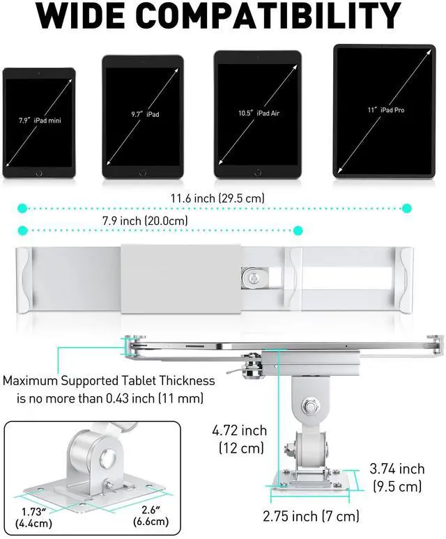 2 rubber pads on the bracket cushion your device while offering secure grip and protection. ^^ Universal Wall / Under Cabinet Mount - Universally compatible with 7 to 11 inch tablets including Apple iPad, iPad Pro, iPad Mini, Microsoft Surface, Samsung Galaxy Tab, Google Pixel Slate and Fire. Enjoy convenient hands-free use of your favorite tablet devices with the AboveTek Tablet Wall Mount Holder!