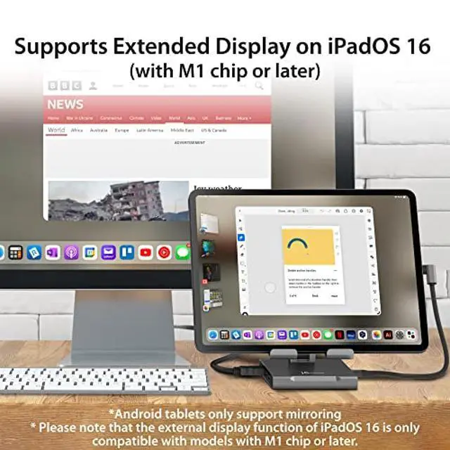 8 in 1 USB-C Dock- This USB C hub for iPad Pro is equipped with HDMI 2.0 port, two USB Type-A 5Gbps ports, SD / microSD 3.0 card reader, audio/mic combo jack and PD 100W pass-through charging, giving you the connections you need for increased productivity. No need to install any drivers.