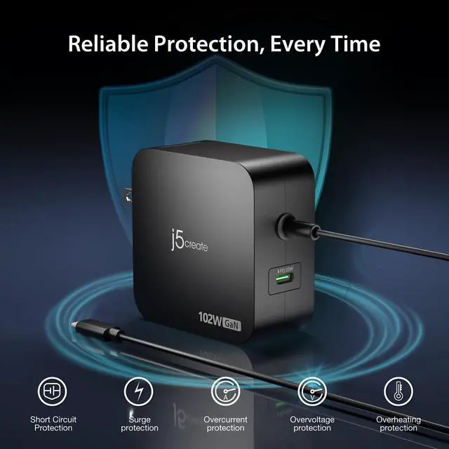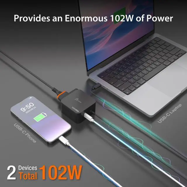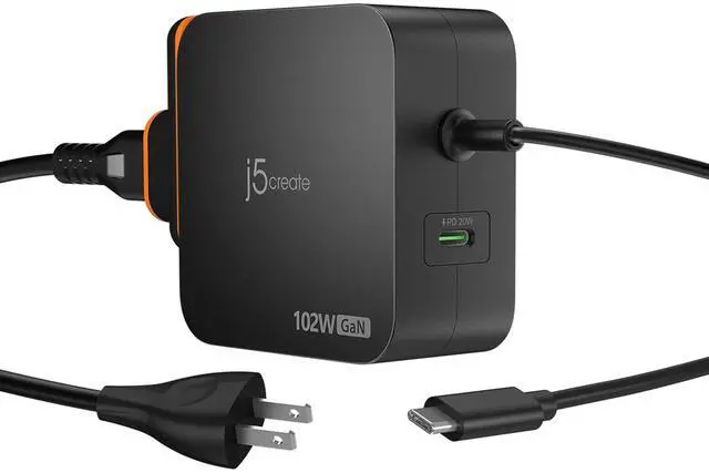 j5create 102W GaN USB-C 2-Port Nano Super Charger w/AC Extension Compact and Portable Design for MacBook, Windows Laptops, iPad, Smartphones, Game Consoles (JUP25100P)