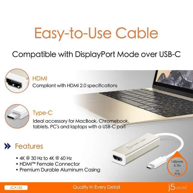 j5create USB Type-C to 4K HDMI Adapter JCA153 / 4K @60 Hz/for MacBook, Chromebook, Type C Laptops