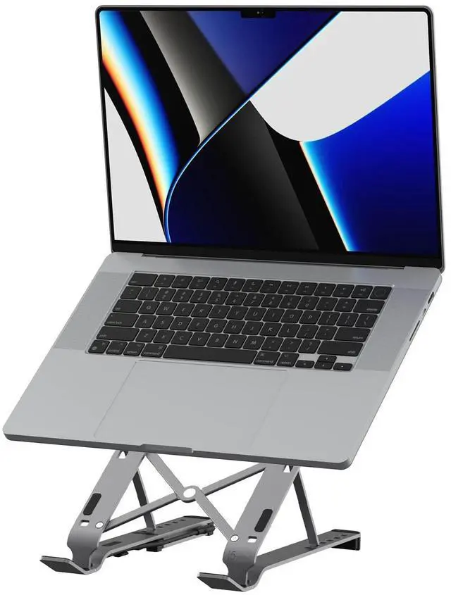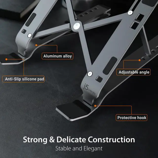 The laptop stand is made of durable aluminum designed to support laptops and a variety of other items such as tablets, books, and similar objects. ^^ Its foldable design allows for easy storage or transport. The viewing angle and height can be adjusted to fit your needs and to optimize your viewing experience. ^^ The integrated USB-C mini hub features four USB 5Gbps Type-A ports, providing the connectivity you need for enhanced productivity and to connect your peripherals. ^^ Aluminum construction with a weight capacity of up to 22 lbs. (10 kg).