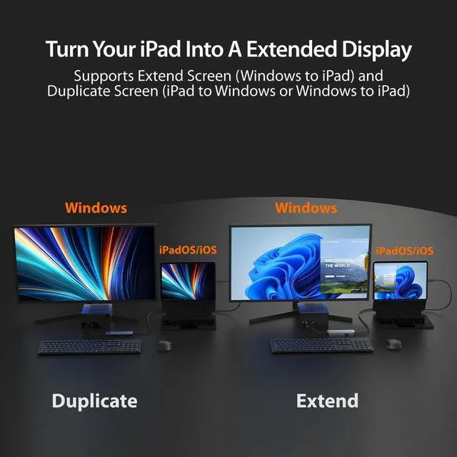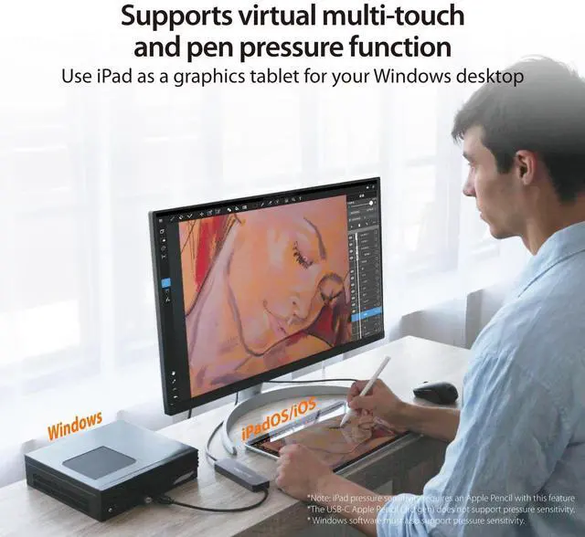 ^^ Turn Your iPad into a Graphics Tablet With virtual multi-touch and pen pressure support, your iPad becomes a responsive drawing pad for Windows, perfect for digital artists, note-takers, and creatives on the go. ^^ Expand Your Connectivity Options Equipped with a 5Gbps USB-C and 5Gbps USB Type-A port (work with Windows laptop only), this compact hub lets you connect essential peripherals like a mouse, keyboard, or flash drive whenever you need them.
