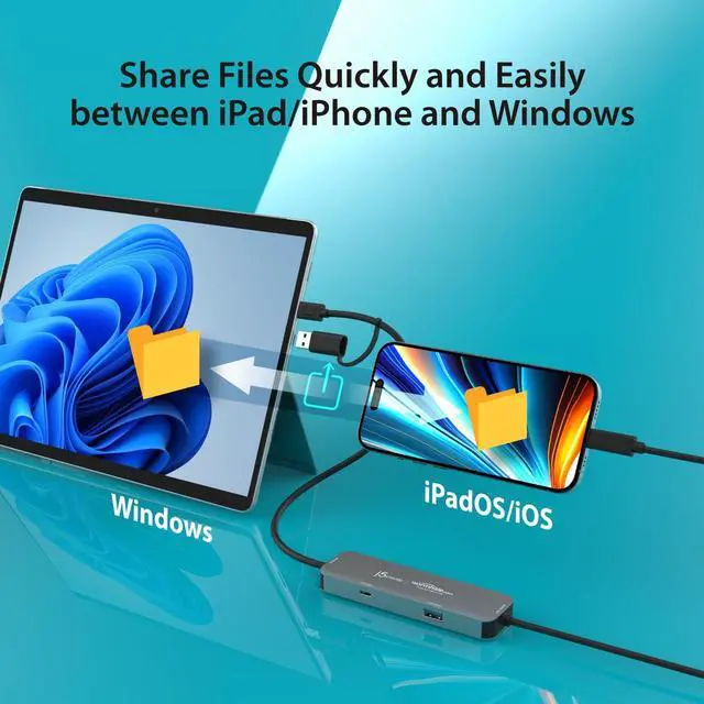 Effortless Windows & iPad/iPhone Collaboration Break platform barriers with the JCH422 CrossLink HUB. Transfer files, share screen, and extend displays between Windows and iPad/iPhone devices seamlessly. ^^ Turn Your iPad Into a Second Display Boost your productivity by using your iPad as a secondary screen for your Windows laptop. Whether extending your workspace or mirroring content, enjoy a fluid and dynamic workflow. ^^ Fast & Simple File Transfers Move documents, photos, and videos effortlessly between your Windows laptop and USB-C iPad/iPhone. No cloud storage or internet connection needed - just plug and transfer.