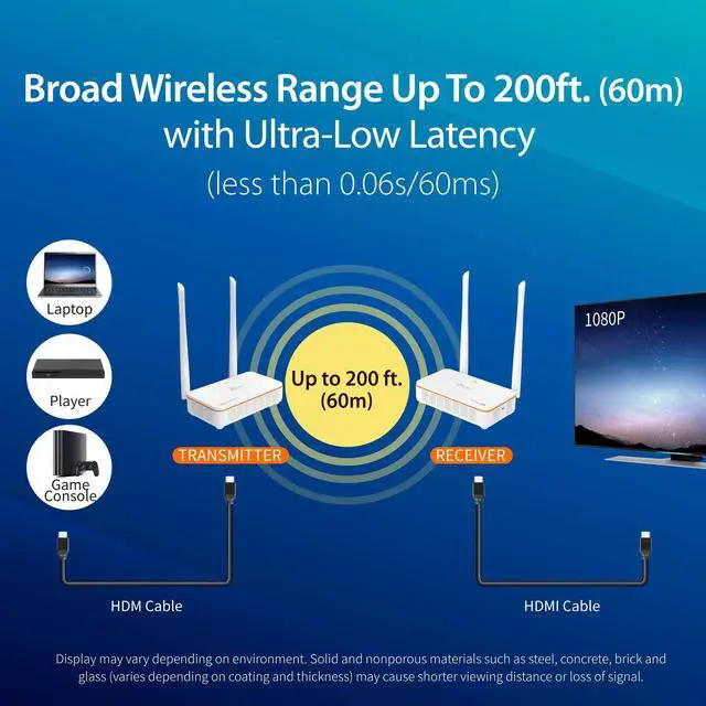^^ Wireless: Stable connection, high quality, and low latency under 60 ms ^^ Supports 480p/576p/720p/1080p/480i/576i/720i/1080i ^^ A flexible audio/video solution for conference rooms (when sharing ideas and data), digital signage (extending the distances between displays) and other applications ^^ Compatible with PS4 and Switch game systems, Blu-ray players, set-top boxes and more
