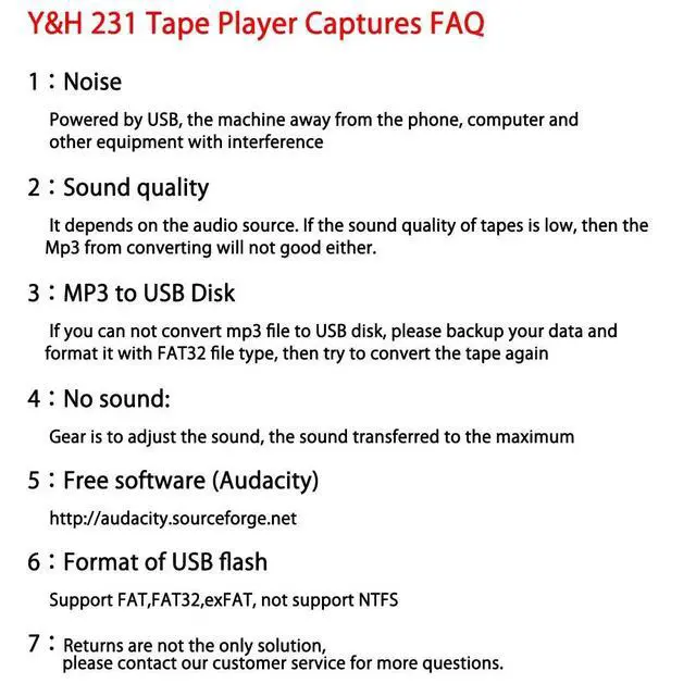Audio rates: 44.1 and 48 kHz, 16-bit for YouTube MP3 makingThis product is not a tape recorder. Please note that it has no recording function. ^^ Cassette converter to mp3 cassette-to-mp3 converter It can be used as Carry it with you, listen to the cassette/tape with headphone, speaker, car stereo. Just plug the 3.55 mm AUX jack into converter, then enjoy the sound memoryThis product has no speakers, so it can't directly put out sound. You need to connect headphones to listen. ^^ Portable DesignWork as cassette player. Lightweight & portable design enables you to play and transfer anywhere at any time. Each package comes with headphone, makes your listening and conversion easier. Share to your Grandparents, Mom, Dad and FriendsWe provide 30-day free return and one-year warranty service