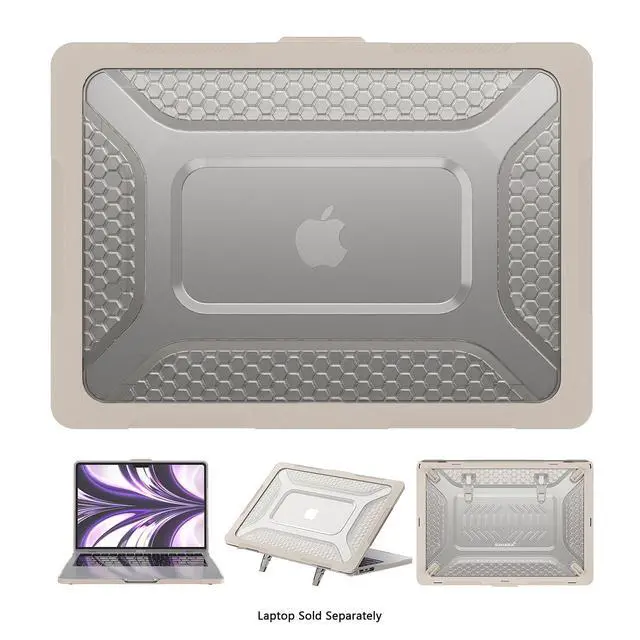 Designed for MacBook Air 13.6 -Inch (20222025, M2M4) Ensures a snug, secure fit with full access to ports and functions. ^^ Built-in adjustable stand Elevates the laptop for better posture and airflow. ^^ Honeycomb-reinforced back panel Adds strength and visual flair while diffusing impact. ^^ Triple-hardened TPU and polycarbonate build Guards against drops, scratches, and wear. ^^ Shock-absorbing corners Help minimize damage from accidental bumps and falls. ^^ Slim, form-fitting profile Easy to slip into bags without bulk. ^^ SAHARA Limited Lifetime Replacement Warranty.