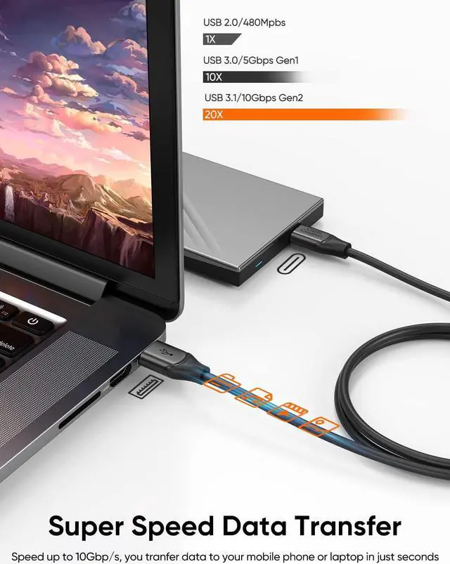 USB 3.2 10Gbps Data Transfer - Gen2 USB 3.2 Type-C to Type-C Cable supports super speed data transmission up to 10Gbps. You can transfer HD movies or songs in seconds with your USB C SSD (Note: This cable does not support data transfer or charging between two laptops)