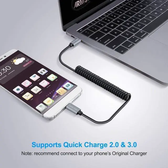 • [(USB C Coiled Cable)] : Coiled usb c cable provides the perfect length for connecting a smartphone to a car charger without having a tangled cable mess. Normal length at 0.45 m (1.5 foot), can be stretche to 1.5m (5 feet) and bounce back to normal length well. For Android Auto use, please make sure that 1-Your phone has downloaded Android Auto APP. 2-Your car supports Android Auto function.