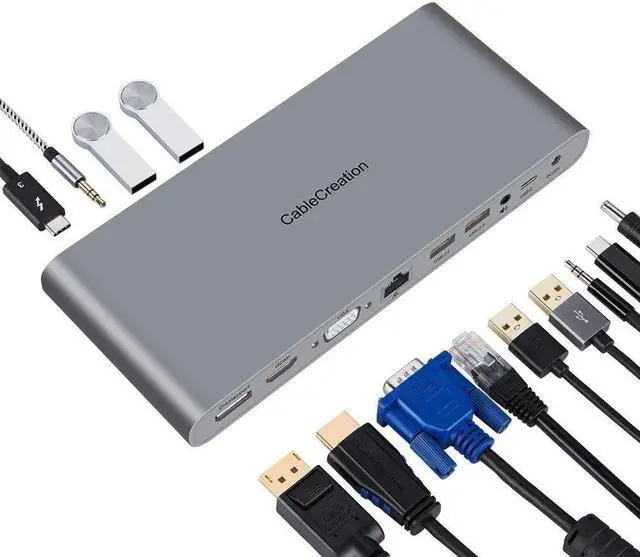 All-You-Need Professional Thunderbolt 3 Hub: CableCreation Type C Dock with ri45, HDMI, VGA, DisplayPort, USB 3.0*2, USB 2.0*2, USB C Female*1, 3.5mm Stereo*2, Thunderbolt 3 Female*1, DC Power supply*1, Thunderbolt 3 cable*1 can meet most of your need