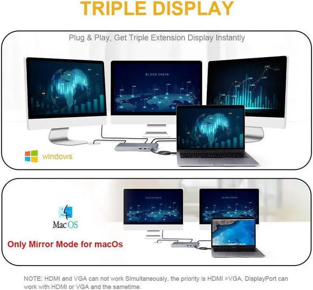 Triple Video Output, Stunning 4K Resolution: This USB C to Multifunction hub has 3 video ports. HDM, VGA and DisplayPort. Stream sports events, HD movies, gaming, PPT, photos, albums directly from your smartphone/laptop to TV