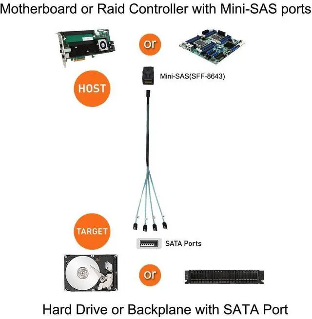 SATA Cable: SFF-8643 is host, connect to the motherboard or RAID Controller with Mini SAS ports. 4x 10Pin SATA is the target, connect to the hard drives with SATA port ^^ Before you buy this cable, please make sure the Mini SAS (SFF-8643) on your motherboard or RAID Controller. If the Mini SAS (SFF-8646) on your backplane, this cable will not work with them ^^