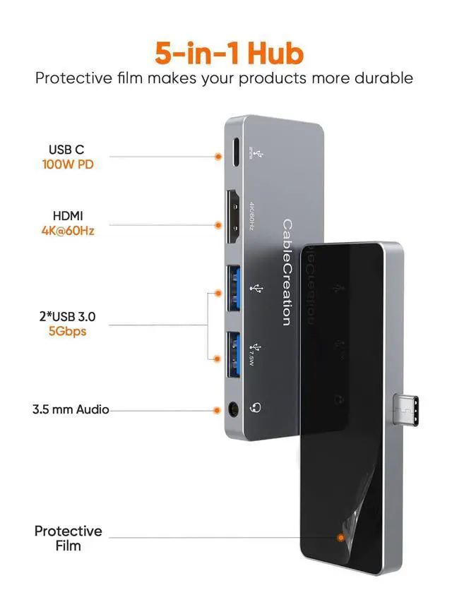 USB C Adapter: Expand your single-port USBC to more ports --- 4K 60Hz HDMI, 3.5 mm audio jack, 2 USB 3.0 and Type-C 100W PD charging port.