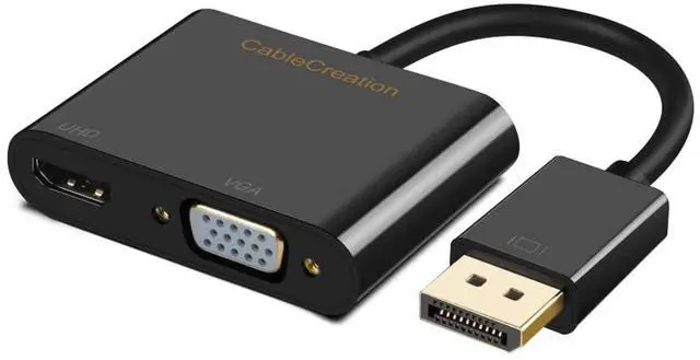 ^^ 4K@60Hz UHD: Compliant with DP 1.2 and HDMI 4k specification, and downward compatible with lower versions; HDMI 2.0 port support ultra HD 4kx2k@60Hz high video resolution; VGA port support 1920*1200@60Hz or 1080P full HD. ^^ NOTES & TIPS1-It can only transfer signal from DisplayPort source to HDMI or VGA monitors/ displays/ projectors. 2-If both of the outputs are connected, then only one output can receive the input signal, HDMI output is prior to VGA output. 3-To enjoy 4K@60Hz resolution, please make sure to use 4K version HDMI cable, if you use a 1.4 or lower version HDMI cable, then you will get 4K@30Hz or lower resolution. ^^ Plug & Play Easy plug and play, no require any software or drivers or extra power supply. ^^ Durable Quality This adapter equipped with gold-plated connectors, Foil & braid multi-layer shielding and tinned copper conductor. Gold-Plated connector ensures a maximum signal quality and stable signal transmission; Foil & braid shielding reduces interference; Tinned copper conductor enhances cable performance.