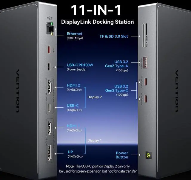 [(11-in-1 DisplayLink Docking Station)] The VENTION docking station combines 11 versatile ports to enhance your productivity: 2x 4K@60Hz HDMI ports, 4K@60Hz DP port, 4K@60Hz USB-C port, 2x 10Gbps USB-C ports, 10Gbps USB-A port, 100W power delivery port, SD/TF 3.0 card readers, 1000Mbps Ethernet port, and a PC host port. Designed for seamless multitasking and efficient connectivity.