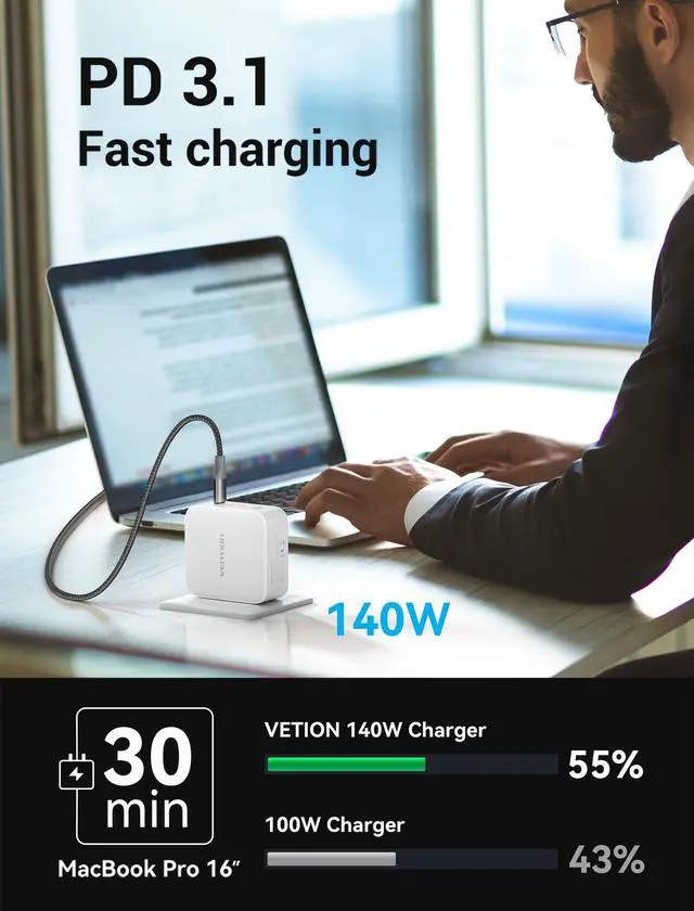 [(Macbook Pro Ultra Fast Charger)] VENTION 140W power charger can fast charge MacBook Pro 16" to 56% in just 30min which is 1.8X quicker than a 65W power adapter (Must be used with USB C to Magsafe 3 charging cable, not included in the package). Thanks to its PD3.1 fast charging protocol, it can easily replace traditional big and annoying power adapters.(When this device has already charged the MACBOOK PRO 16, it cannot simultaneously charge other devices)