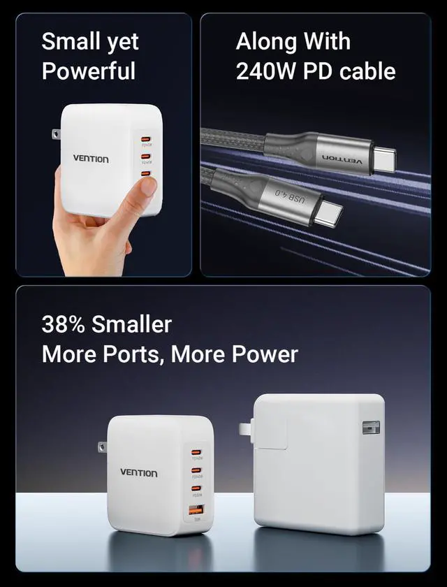 VENTION 340W MacBook Pro Charger, 140W USB C Charger 4-Ports Foldable GaN Charger for MacBook Pro 16''/14''/13'', MacBook Air 15'', iPhone 15/14/Pro max, Chromebook (with 240w Cable)