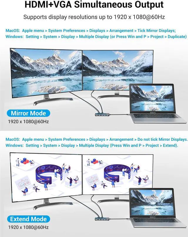 Enhanced Display Flexibility: The Laptop Docking Station features 4K HDMI ports that support resolutions up to 3840 x 2160@30Hz, and a VGA port that supports display resolutions up to 1920 x 1080@60Hz. In Mirror Mode, you can enjoy the same content on all three displays, while in Extend Mode, the two external displays can show different content from the laptop's screen.
