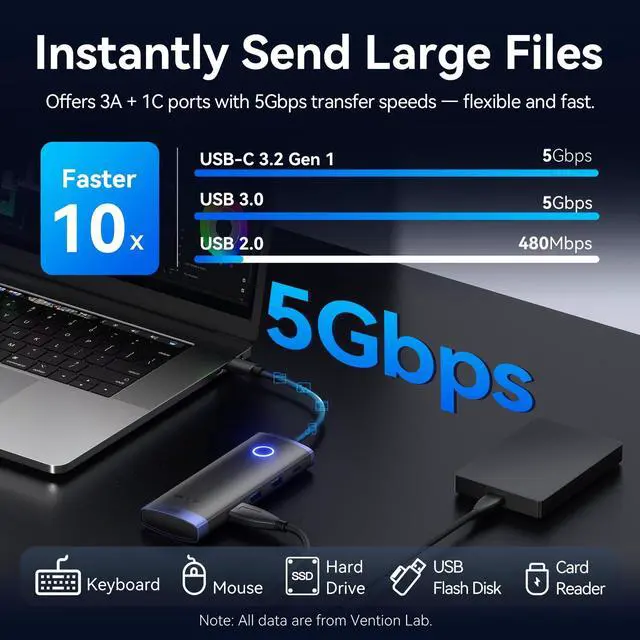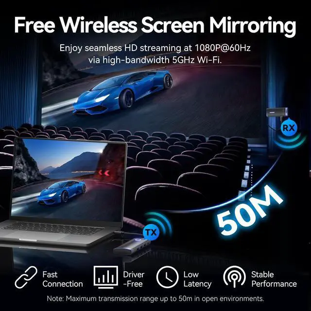 4K@30Hz HD QualityThe VENTION USB C Wireless HDMI Docking Station supports 4K@30Hz when using the wired HDMI connection, and is backward compatible with 2k /1080P devices, and supports 1080P@60hz when using the wireless HDMI connection, crystal-clear images and vibrant colors. Whether it is education, business meetings or home entertainment, it can meet your needs ^^ 5Gbps Data TransferEnjoy blazing-fast data transfer with 3 USB-A and 1 USB-C ports supporting up to 5Gbps speeds. Transfer 1GB files in seconds, saving time and boosting work efficiency ^^ 50M Long Range and 5G Band TechnologyThe wireless HDMI transmitter and receiver distance reaches up to 165FT/50M, utilizing a 5G transmission protocol for stronger and more stable signals.