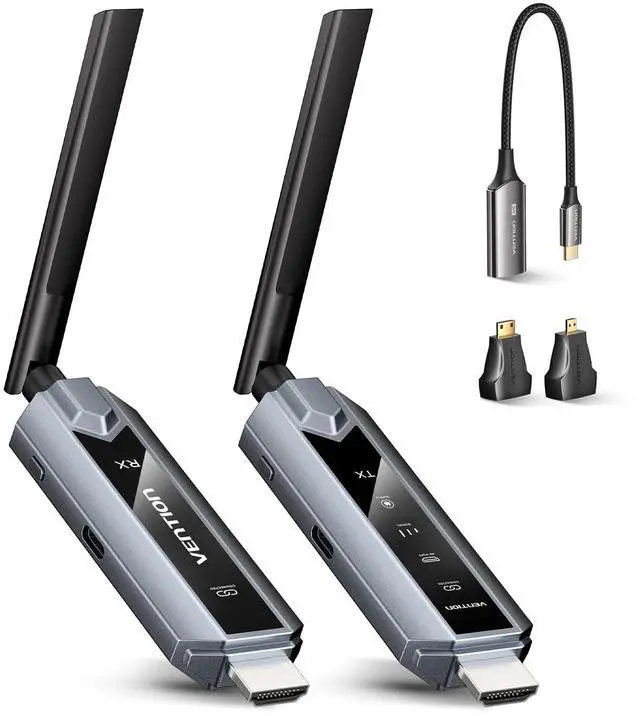 [Upgraded LED Display] VENTION Wireless HDMI transmitter and receiver with no drivers needed, designed with newly upgraded LED display. Real-time LED indicators for connection, signal, output, and power make setup effortless and problem-solving instant. ^^ [656FT Ultra-long Distance Transmission with ZeroDrop Tech] VENTION wireless HDMI transmitter Equipped with 5dBi high-gain antennas, this HDMI wireless extender delivers robust long-range transmission, breaking spatial barriers with flawless streaming up to 656ft/200m. ZeroDrop Technology delivers lag-free operation and pristine streaming while keeping your workspace clutter-free.