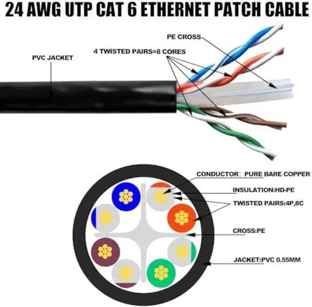 High Quality Cat 6 Cable-Features 8 pure bare copper conductors 24AWG with HDPE Insulation. Each of the 4 unshielded twisted pairs (UTP) are separated by a PE cross insulation to isolates pairs and prevent crosstalk and covered by a 5.5mm PVC jacket.