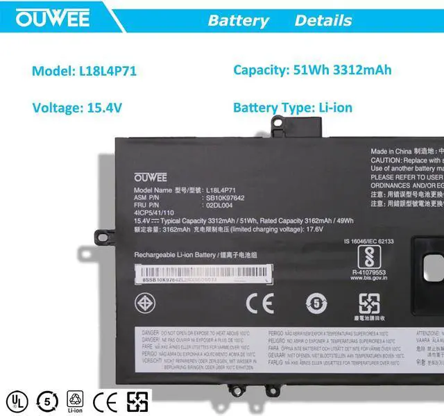 • [(Specifications)] Replacement Battery for Lenovo thinkpad battery, Type: Li-ion;Our L18L4P71 Battery Replacement for Lenovo Standard Rechargeable li-ion battery Type L18L4P71 Voltage:15.4V; Capacity:51Wh 3312mAh; Cells:4 cells; Color: Black;Condition: New; Battery lasts: 3-6 hours, Packages includes: 1x L18L4P71 laptop battery,2 x Free Screwdrivers,1x Instruction for Laptop battery