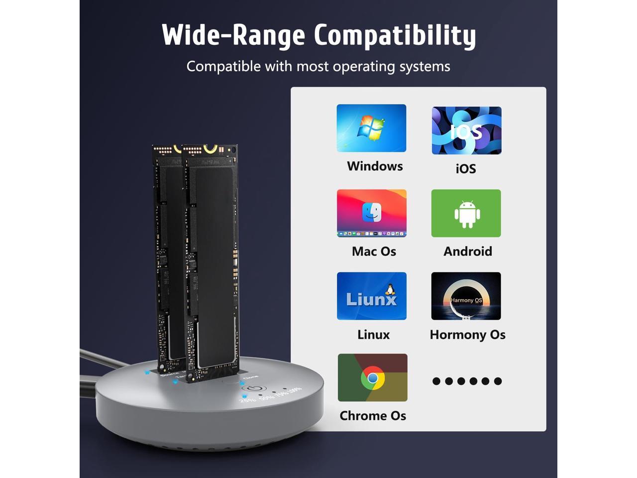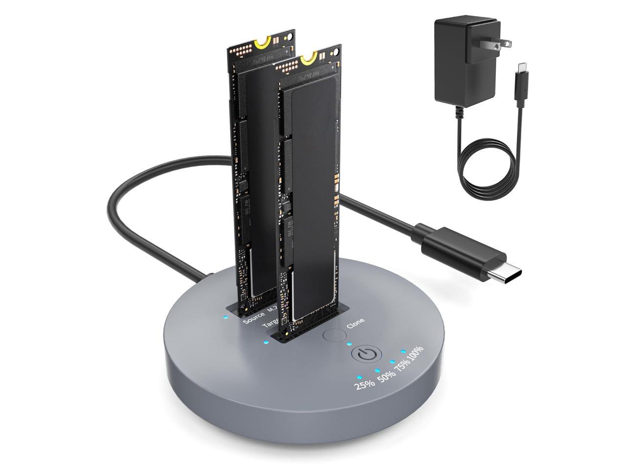 - Support Offline Clone: This M.2 NVMe cloner dock station can support offline clone and it is super easy to operate. Just insert 2 SSDs into respective slots, connect the power adapter (do not connect computer), Press the power switch,then long press clone button for 5 seconds until 25% light is flashing blue. Please note that the source disk capacity should not exceed the target disk capacity.