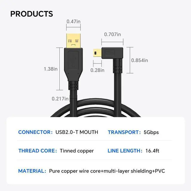 YAMCOWL 16ft Mini-B 5-Pin Data Transfer Cable for Fast Transfer and Real-time Preview, Suitable for Sony, Canon, Nikon, Fuji, and Other Cameras and Electronic Devices with mini USB Interface