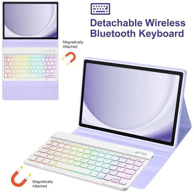 7 Color Keyboard & Magnetic Adsorption:This Samsung A9 Plus tablet case with keyboard designed with 7 Color backlit keyboard, emit charming brilliance in the dark/night, becoming a fashionable tablet. The keyboard can easily connect to Bluetooth, built-in rechargeable battery, full of electricity, can be used continuously for 10 days. The keyboard can be adsorbed on Galaxy Tab A9 Plus Case, providing a stable typing experience