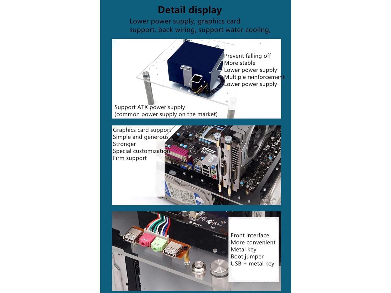 - Power supply:supports ATX/SFX/small 1U power supply, and is equipped with a metal switch to make booting more convenient, USB and audio The port is convenient for external connection.The power supply is on the bottom,so it will make it more stable to use.