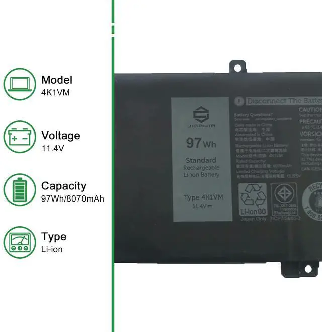 • Model: 4K1VM // Voltage: 11.4V // Capacity: 97Wh 8070mAh // Color: Black // Type: Plug & Play Li-ion Battery.