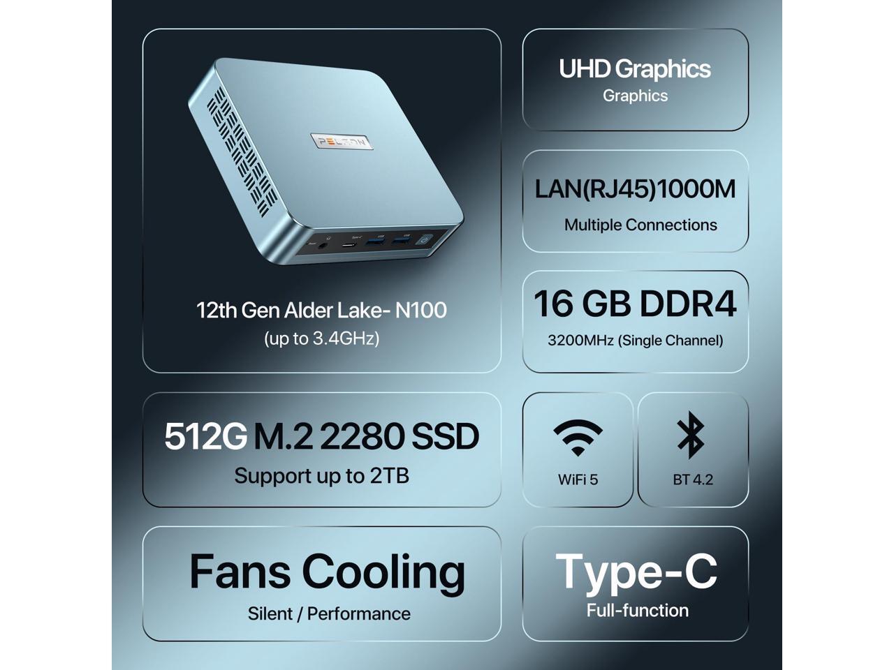 - [(The Latest 12th Intel Alder Lake N100)] The 12th generation Intel Alder Lake N100, the frequency is as high as 3.4 GHz, which is faster than the 11th-generation Intel J4125, N5105 and N5095.This mini computer has a significantly faster speed, better performance, and lower power consumption (6W up to 15W), providing high-performance operation for office work, daily tasks and home entertainment.