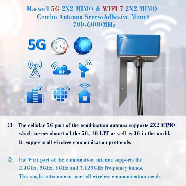 Maswell 4 Combo 5G 2X2 MIMO Plus WIFI7 700-6000MHz Antenna Cellular 5G 4G LTE Screw and Adhesive and L Plate Mount omnidirectional Bluetooth Wimax Zigbee Antenna SMA Male RP SMA Plug Not for Boosting
